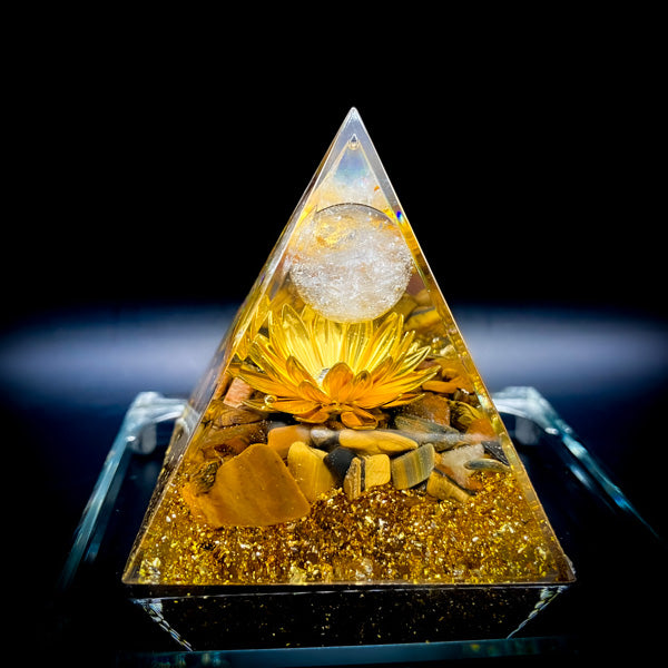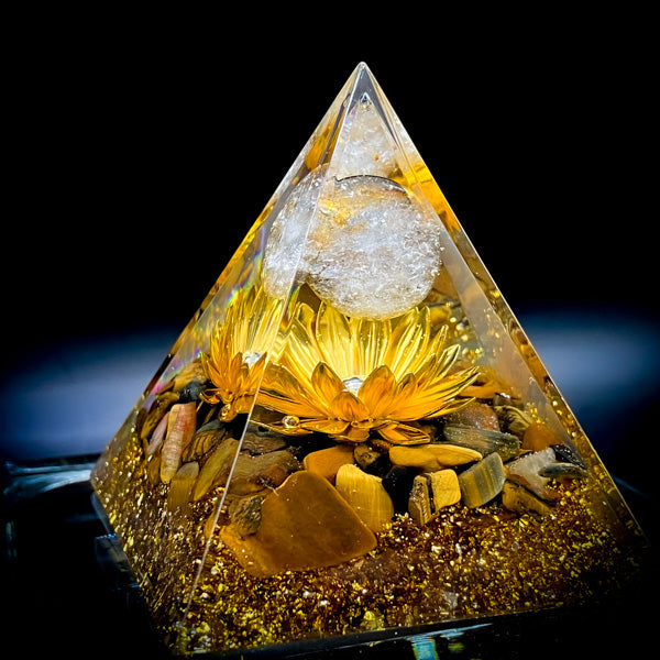 金運アップに効果大のタイガーアイが敷き詰られ、幸運をつかむ金の蓮を施したたデザインの「黄金のピラミッド」は、ピラミッドパワーと同時に金運アップのパワーを秘めており、そこに厳選魔術師の黒魔術によって最強なる金運魔力が備わっています。