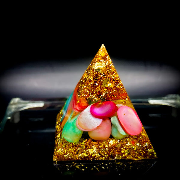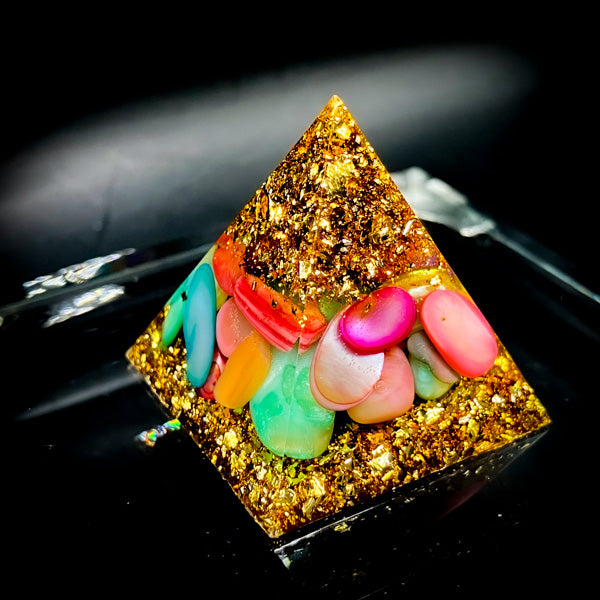 金運アップに適した金色魔石と愛に満たされた世界をイメージするカラフル魔石のに各々の魔術をほどこした融合インテリアとして誕生したのが「金彩のピラミス」です。
