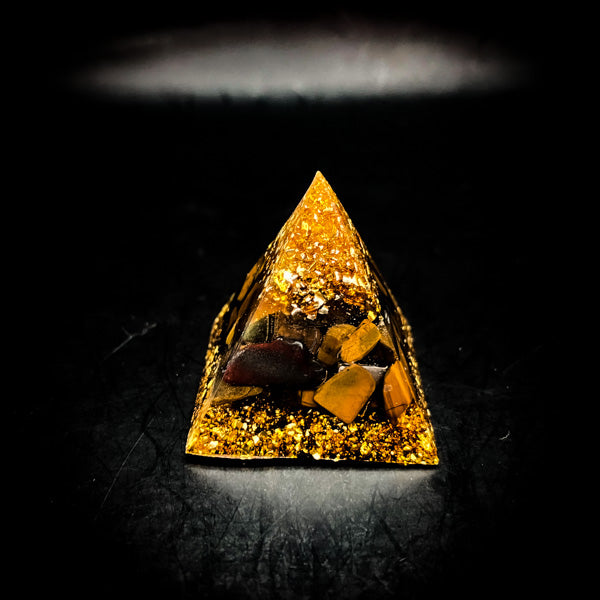 金運アップに効果大のタイガーアイを金散石が包むデザインの「黄金のピラミッド2」は、ピラミッドパワーと同時に金運アップのパワーを秘めており、そこに厳選魔術師の黒魔術によって最強なる金運魔力が備わっています。