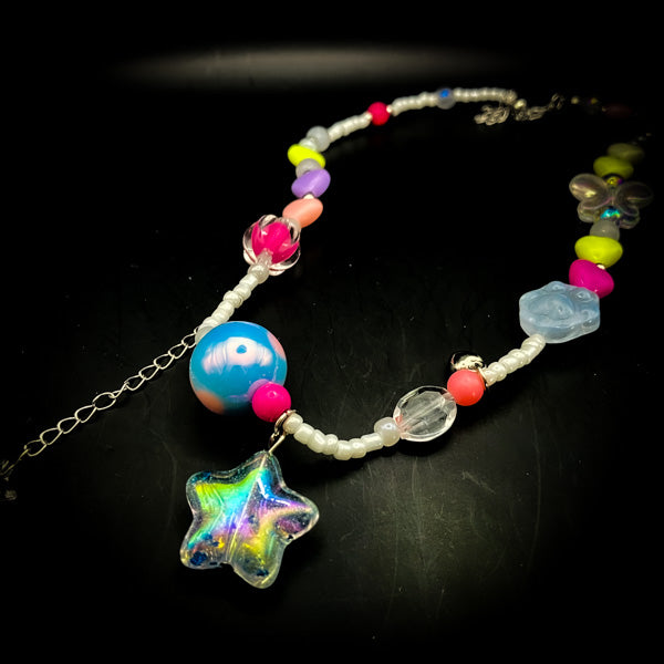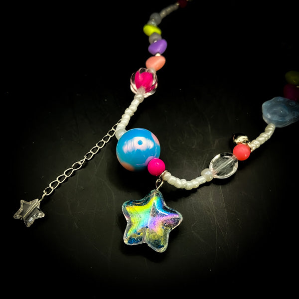 守護と悪魔のシンボルとする五芒星とカラフル魔石を連ねたチャームネックレス。貴方の人生を守り願望達成へと誘うアレイスターの涙でも最高ランクに位置する魔術品。