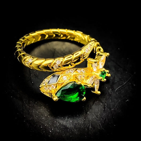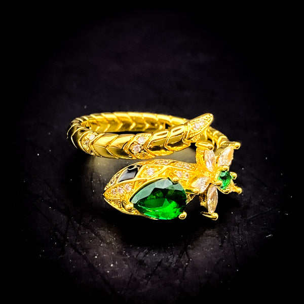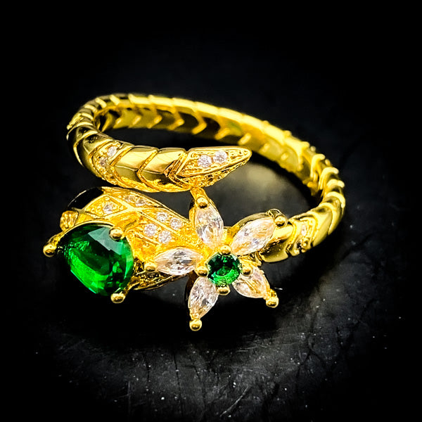 力強さを強調する金をベースに、理想を実現化させる知恵と行動力を授ける緑魔石と輝く花を中央に施した激レア品。